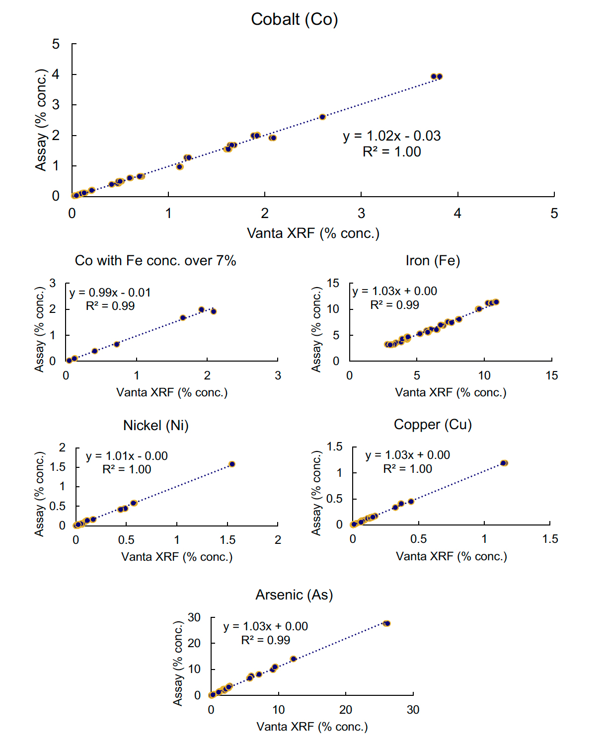 Vanta X射線熒光分析儀得出的數(shù)據與實驗室數(shù)據在鈷(Co)含量方面顯示出卓越的相關性,即使在濃度低于0.05%且鐵(Fe)含量超過10%的情況下也是如此。砷(As)、鎳(Ni)和銅(Cu)的數(shù)據也與實驗室數(shù)值相比展現(xiàn)了極高的準確性。