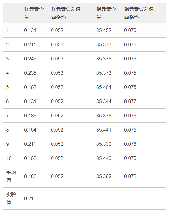 在檢測牌號為380的鋁合金時,使用40 kV光束進行3秒鐘檢測,以及使用13 kV光束進行20秒鐘檢測,所得到的結果。