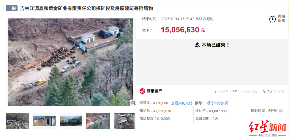 紅星資本局近日消息,吉林江源鑫和黃金礦業(yè)有限責(zé)任公司探礦權(quán)及房屋建筑等附屬物在阿里資產(chǎn)拍賣平臺被拍賣,本次拍賣經(jīng)過931輪出價(包括922次延時出價),最終以1505.663萬元的價格成交,對比起拍價255.663萬元,溢價1250萬元,溢價率達(dá)489%。